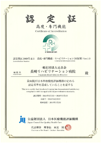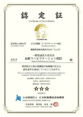 機能評価Evaluation 病院の組織的活動を患者さまの目に触れない部分も含めて、第三者として(公財)日本医療機能評価機構が評価し、病院の優れている点や課題を明らかにするものです。審査の結果、一定の水準を満たしていると認められた病院に対して認定され、当院は、リハビリテーションの機能に特化して評価する高度・専門機能評価も認定を受けています。 リハビリテーション病院 3rdG:Ver3.0 高度・専門機能 リハビリテーション(回復期)